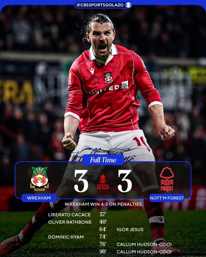 英格兰足总杯第3轮,本赛季刚刚升入英冠的雷克瑟姆常规时间3-3,经历加时和点球的鏖战淘汰了英超球队诺丁汉森林,成功晋级下一轮!